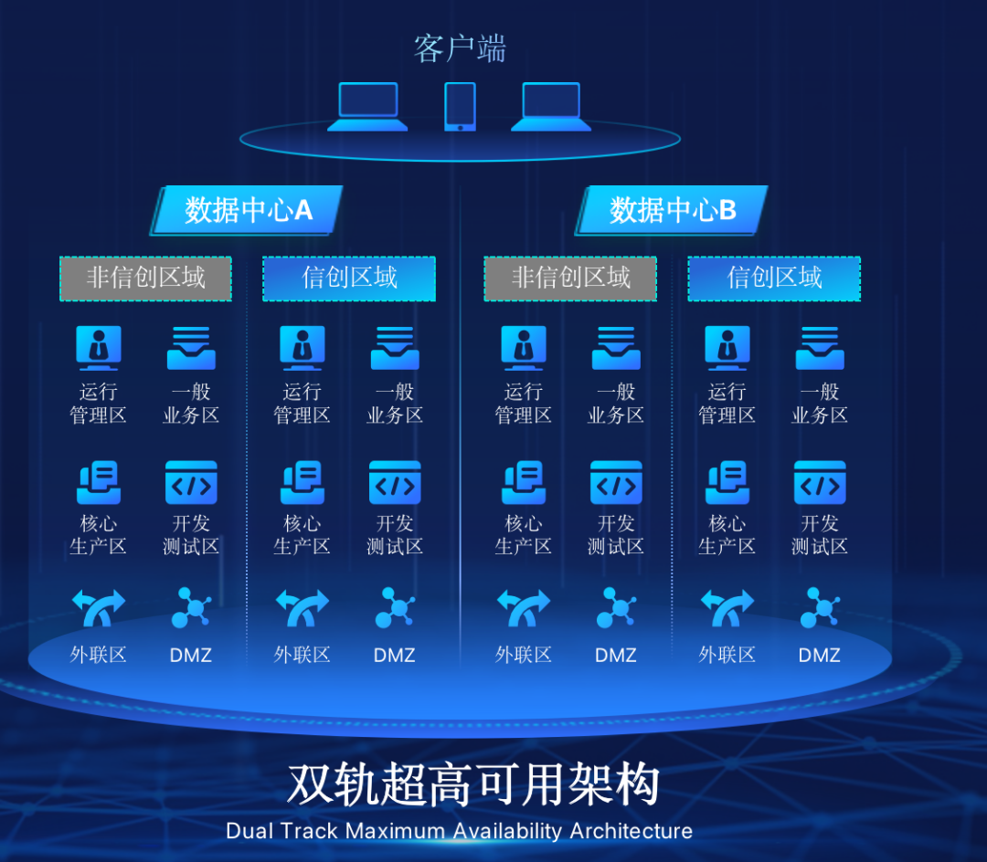 云配查系统在企业面临自主创新IT基础重构过程中,推出的全新架构双轨超高可用架构(简称DTMAA),在双活数据中心的分区调度基础上,添加每个数据中心内信创域和非信创域的分域调度,来实现分区分域协同的多活双轨超高可用。